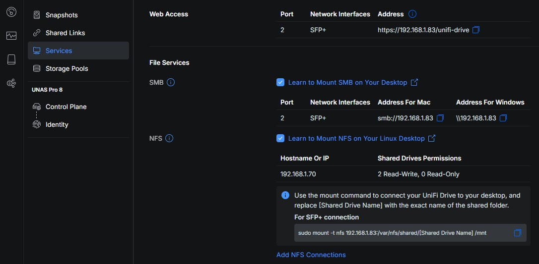 Completed setup enabling NFS service and connections for Unifi Drive